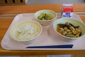 麦ごはん、かつおの香り揚げ、ごまあえ、黒皮かぼちゃのみそ汁、牛乳
