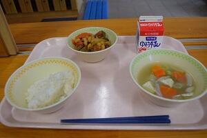 高千穂新米ごはん、豚肉とれんこんの炒め煮、のっぺい汁、かりかりなばちゃん、牛乳
