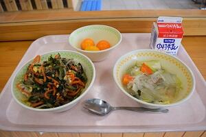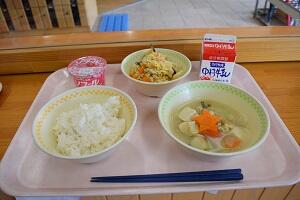 麦ごはん、魚のみそ汁、千切り大根の卵とじ、ヨーグルト、牛乳