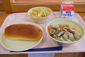 牛乳、ミルクパン、五目うどん、かみかみサラダ