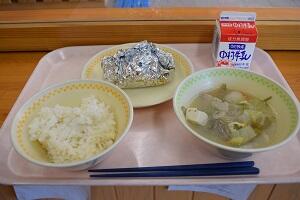 麦ごはん、魚のチーズ蒸し焼き、豚汁、牛乳