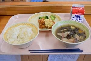 麦ごはん、チキン南蛮タルタルソース、ブロッコリー、もずくのスープ、牛乳