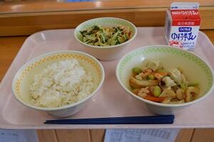 麦ごはん、えびと高野豆腐のうま煮、甘酢あえ、牛乳
