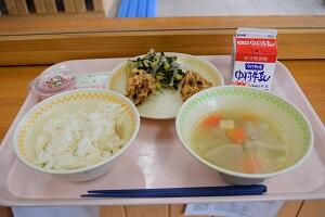 麦ごはん、大豆のかきあげ、ほうれん草のあえ物、かみなり汁、牛乳、花ゼリー