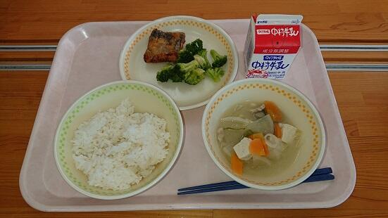 麦ごはん、さわらの竜田揚げ、ブロッコリー、みそけんちん汁、牛乳