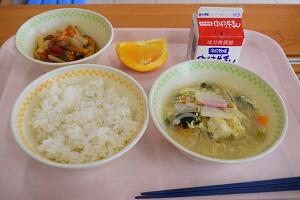 麦ごはん、チンジャオロース、卵スープ、オレンジ、牛乳