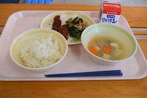 麦ごはん、かつおの香り揚げ、ごまあえ、とりごぼう汁、牛乳