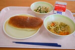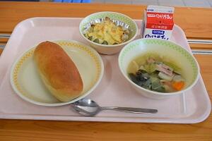 黒糖パン、マカロニグラタン、野菜スープ、牛乳