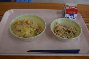 他人丼、千切り大根のオーロラサラダ、牛乳