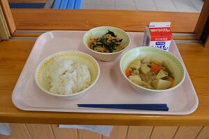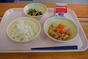 麦ごはん、とりにくと里芋のみそに、ほうれん草とツナのおひたし、牛乳