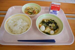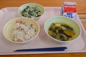 たこごはん、かぼちゃのみそ汁、洋風白和え、牛乳