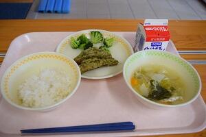 麦ごはん、あじの磯辺揚げ、ブロッコリー、野菜のそぼろ汁、牛乳