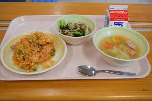 チキンライス、ポテトスープ、ブロッコリーのサラダ、牛乳