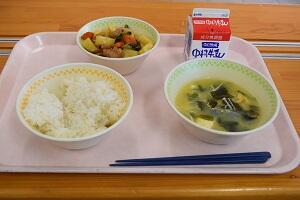 麦ごはん、鶏肉とゴーヤの揚げ煮、かぼちゃのみそ汁、牛乳