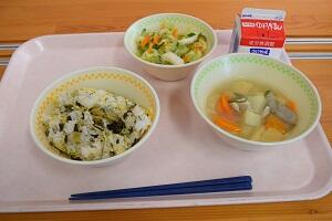 高菜めし、吉野汁、イカと野菜のマリネ、牛乳