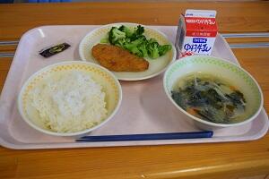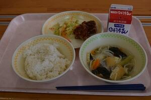 麦ごはん、とり肉のから揚げ、添え野菜、魚そうめん汁、牛乳