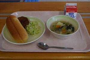 ドッグパン、ハンバーグドッグ、野菜スープ、牛乳