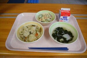 とりめし、すまし汁、ツナマヨネーズサラダ、牛乳