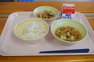 麦ごはん、マーボー豆腐、中華サラダ、牛乳