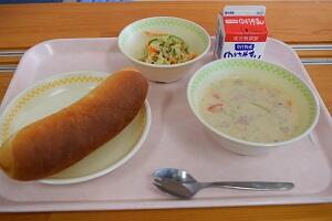 コッペパン、白花豆のポタージュ、ツナサラダ、牛乳