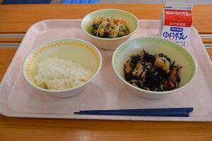 麦ごはん、厚揚げのいそ煮、野菜とツナの和えもの、牛乳