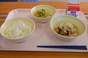 麦ごはん、いわしの甘露煮、野菜のレモン和え、豚汁、牛乳