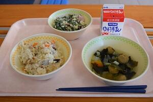 千切り大根ご飯、あじのつみれ汁、洋風白あえ、牛乳