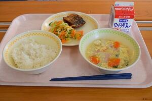 麦ごはん、さわらの竜田揚げ、甘酢あえ、かきたま汁、牛乳