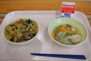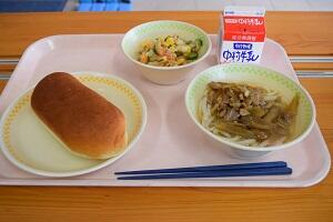 ミルクパン、神楽うどん、大豆とツナのサラダ、牛乳