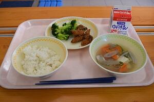 麦ごはん、いわしの甘露煮、野菜のレモン和え、豚汁、牛乳