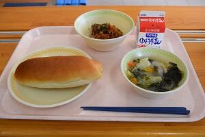 麦ごはん、厚揚げのいそ煮、野菜とツナの和えもの、牛乳