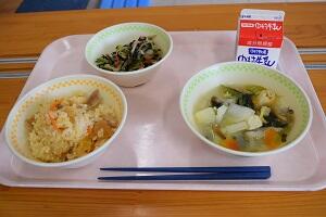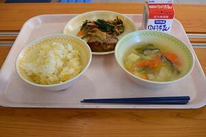 麦ごはん、いわしの甘露煮、野菜のレモン和え、豚汁、牛乳