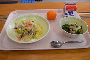 クリームかけピラフ、小松菜のサラダ、みかん、牛乳