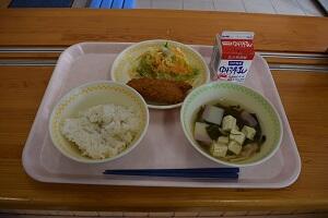 麦ごはん、さけのチーズフライ、レモンあえ、若竹汁、牛乳