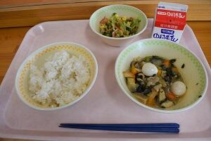 麦ごはん、とりにくと里芋のみそに、小松菜のサラダ、牛乳