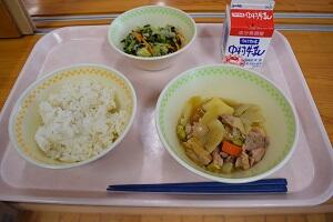 たけのこごはん、カニたまスープ、洋風白和え、牛乳