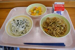 減量わかめごはん、焼きそば、フルーツポンチ、牛乳