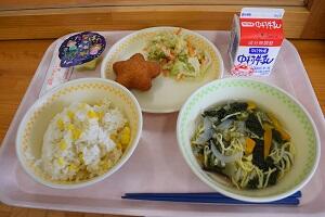 コーンごはん、七夕汁、星のコロッケ、添え野菜、七夕デザート、牛乳