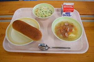 コッペパン、トマトと玉ねぎのにこにこスープ、スパゲティサラダ、牛乳