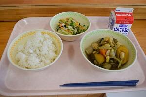 茶飯、鶏ごぼう汁、魚のみそマヨネーズ焼き、牛乳