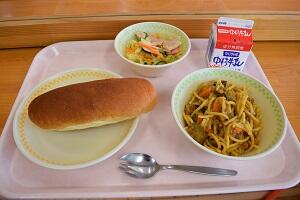キャロットパン、なすとひきにくのスパゲティ、フレンチサラダ、牛乳(ぬくもりランチ)
