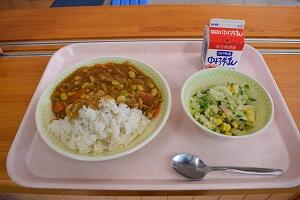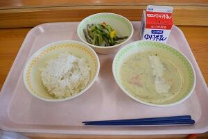 麦ごはん、豆乳コーンスープ、きびなごのエスカベッシュ、牛乳