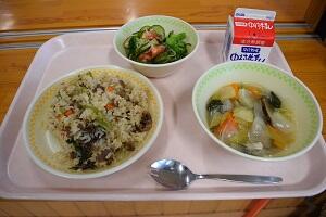 高千穂牛とレタスのピラフ、マロニースープ、高千穂どれサラダ、牛乳(ぬくもりランチ)