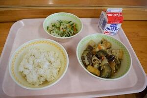 麦ごはん、なすと厚揚げのみそ炒め、きゅうりとちりめんの酢のもの、牛乳