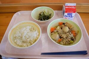 麦ごはん、里芋のそぼろ煮、おかかあえ、牛乳