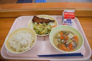 麦ごはん、けんちん汁、いわしの蒲焼き、即席漬け、牛乳