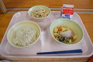 麦ごはん、高野豆腐の卵とじ、千切り大根のオーロラサラダ、牛乳