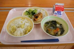 くりごはん、きのこの山里汁、ブロッコリー、真鯛の西京焼き、牛乳(ぬくもりランチ)