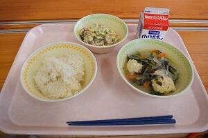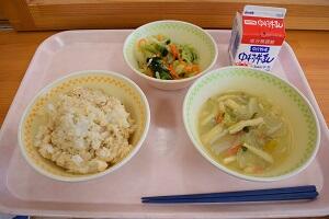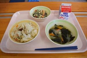 千切り大根ごはん、小松菜のみそ汁、ひじきの白和え、牛乳