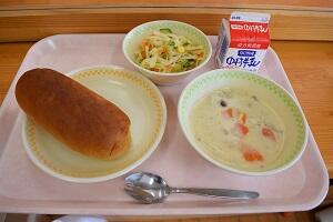 黒糖パン、秋味シチュー、れんこんサラダ、牛乳